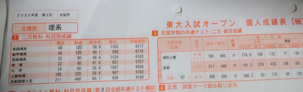 息子は理三志望ではありませんが、理三と書いてみたかったらしくD判定という結果に。しかし、理一であればA判定とのこと。